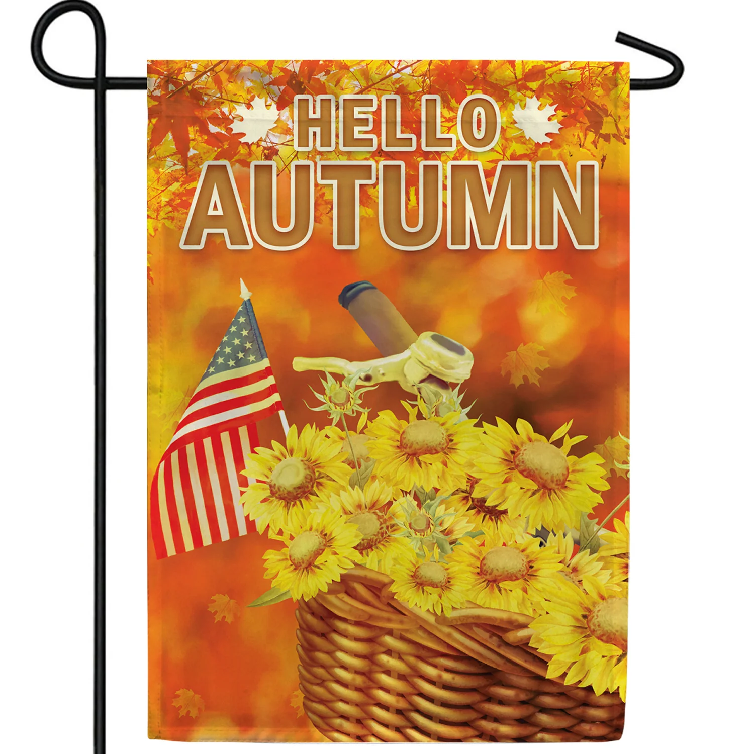 A bright Autumn design features a bike with basket filled with sunflowers. A small American Flag sticks out of the basket. Features Autumn leaves on the top border. Caption says "Hello Autumn".