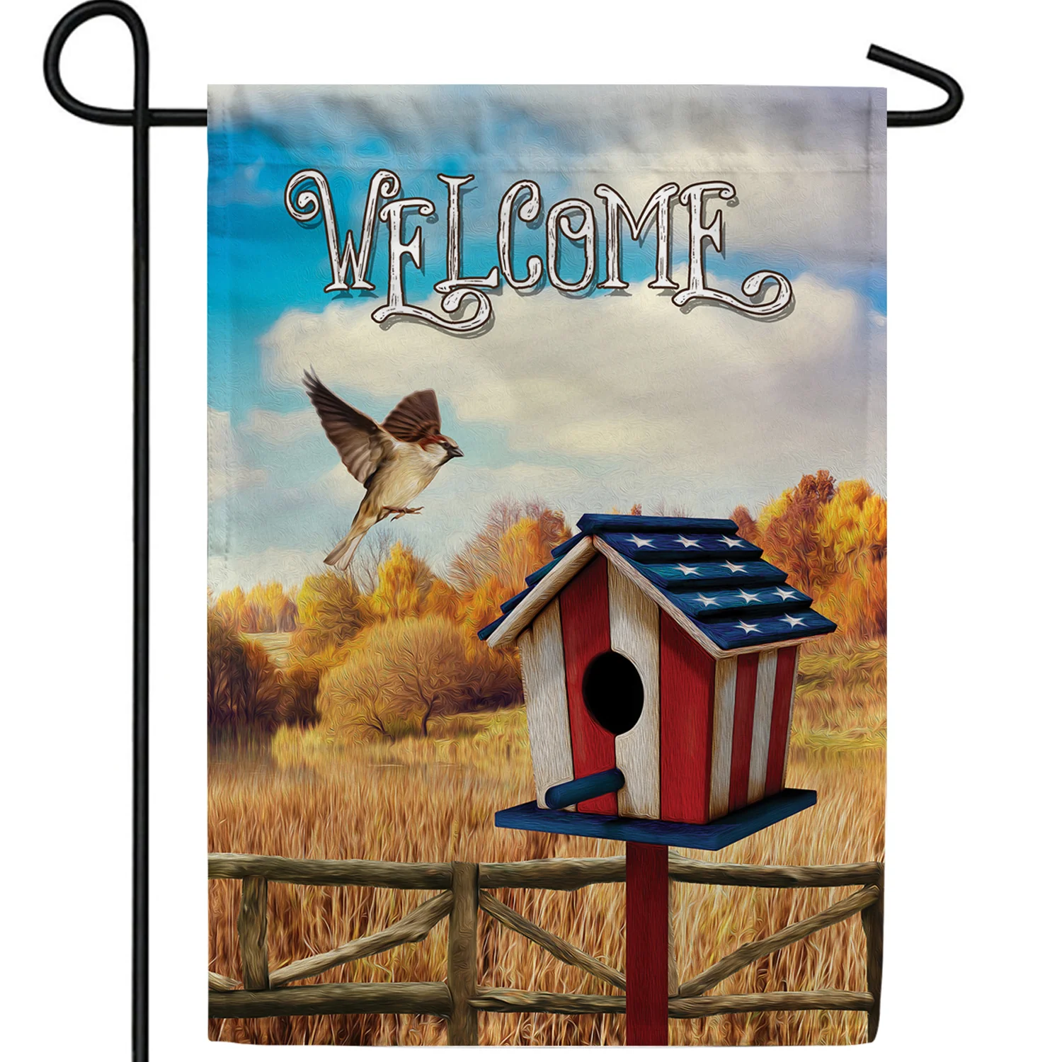 Showcases a patriotic birdhouse and a bird on a beautiful Autumn back ground. Caption says, "Welcome".